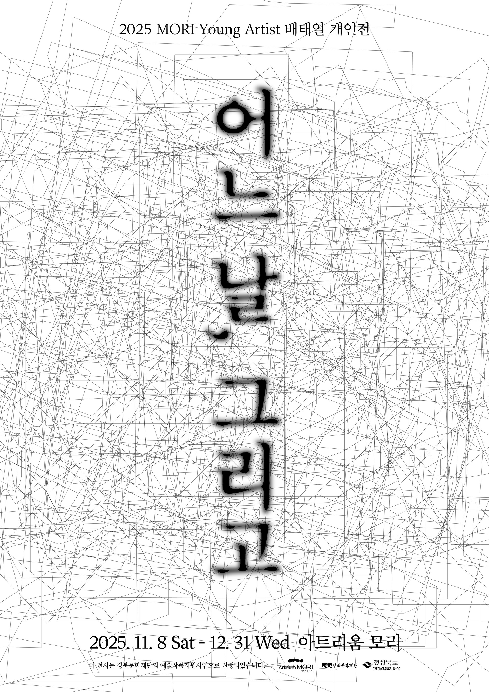 아트리움 모리는 청년작가 발굴 및 지원을 위해 매년 개최하는 청년작가 공모 「2025 MORI Young Artist」의 두 번째 선정자로 배태열 작가를 맞이했다. 배태열 개인전 《어느 날, 그리고》 포스터의 배경이 되는 복잡한 선들은 작가가 실제로 도시를 걸어 다닌 경로의 흔적들이다. 그곳이 어디인지는 중요하지 않다. 그것은 구체적인 장소의 재현이 아니라 한 인간이 세계 속에 자신을 새기려는 시도이기 때문이다. 중요한 것은 무엇 하나 온전히 나의 것이라 느끼기 어려운 이 거대한 도시 위에 작가의 발걸음이 닿았고, 발걸음이 닿은 모든 공간은 그의 실존이 통과한 세상의 단면으로 지금 여기, 우리의 시선 앞에 펼쳐져 있다는 점이다.