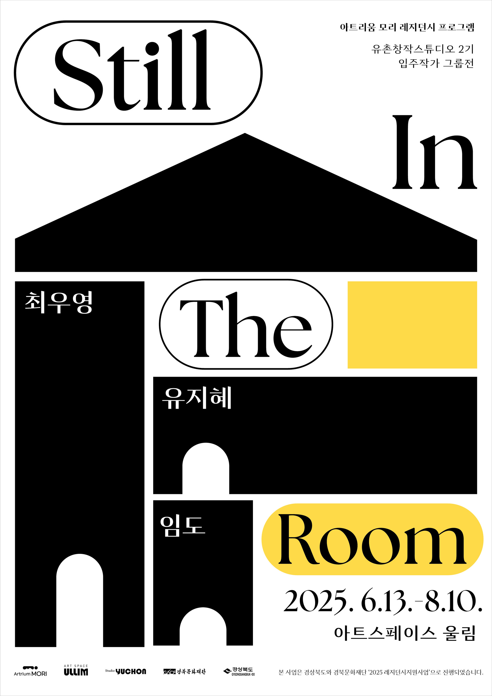 여러 장르의 예술가가 한자리에 함께 머물고 교류하는 과정을 통해 새로운 의미를 생성하는 레지던시 프로그램은 공간을 매개로 예술적 상호작용을 창출한다. 아트리움 모리의 레지던시 프로그램 유촌창작스튜디오는 2025년 4월, 2기 입주작가인 유지혜, 임도, 최우영 작가를 맞이했다. 단순한 작업 공간을 넘어 서로의 존재에 대해 미묘하게 반응하는 섬세한 시간들을 켜켜이 쌓아온 이 장소에서, 그들의 작업세계를 살펴보는 그룹전 ‘Still In The Room’을 개최한다.